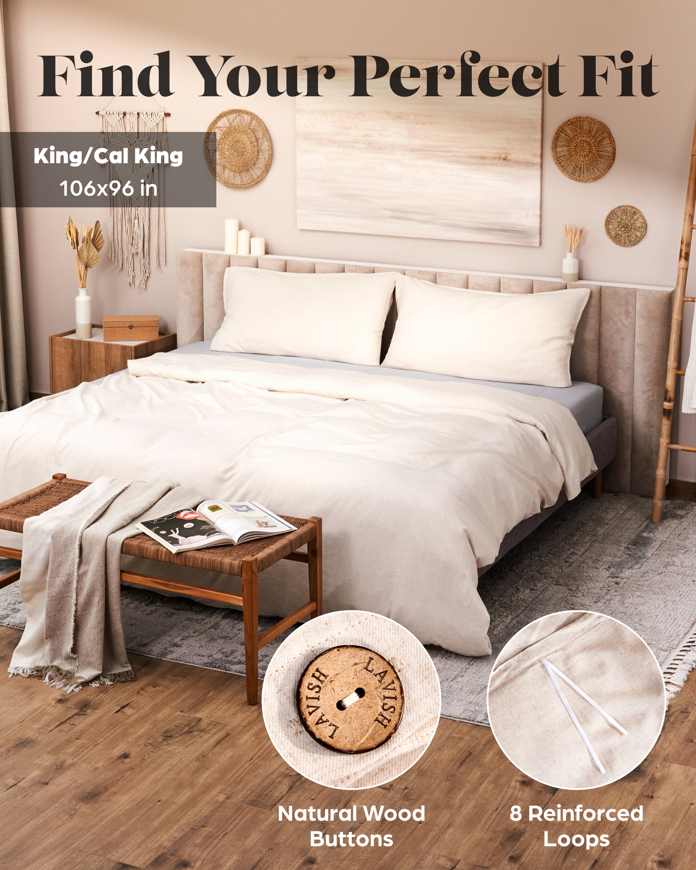 Softest Linen Blend Duvet Cover – 100% pure linen can be scratchy and rough. So we at Lavish Comforts created the softest natural linen duvet cover, perfectly blended with viscose from bamboo to create the softest, breathable, premium linen duvet cover set. Crafted from 30% premium flax linen and 70% organic bamboo viscose, this king linen duvet cover includes a 104" x 86" duvet cover and 2 king pillowcases.